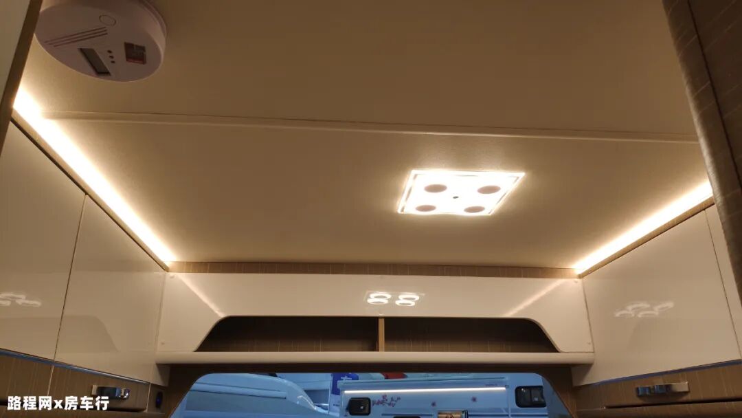 顶部设有照明灯、照明灯带为内部提供充足、良好的照明;两侧设有多组储物吊柜,尾部上方设有储物格,储物空间进一步增加;同时内部设有多个阅读灯方便夜间休息时使用;
