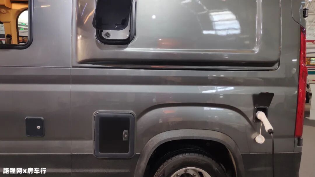车身外部设有电动踏步、黑水箱、充电口、注水口、顶置铝合金行李架+太阳能板+遮阳棚、户外越野探照灯组、越野套件等设施,运动感十足,配套设施丰富,充分满足户外驻车生活、户外越野等场景的使用需求;主乘客门位于右侧,配有纱网放置夏日蚊虫侵袭,乘客门内侧底部设有外置抽拉式柴油灶,满足你户外烹饪的使用需求;