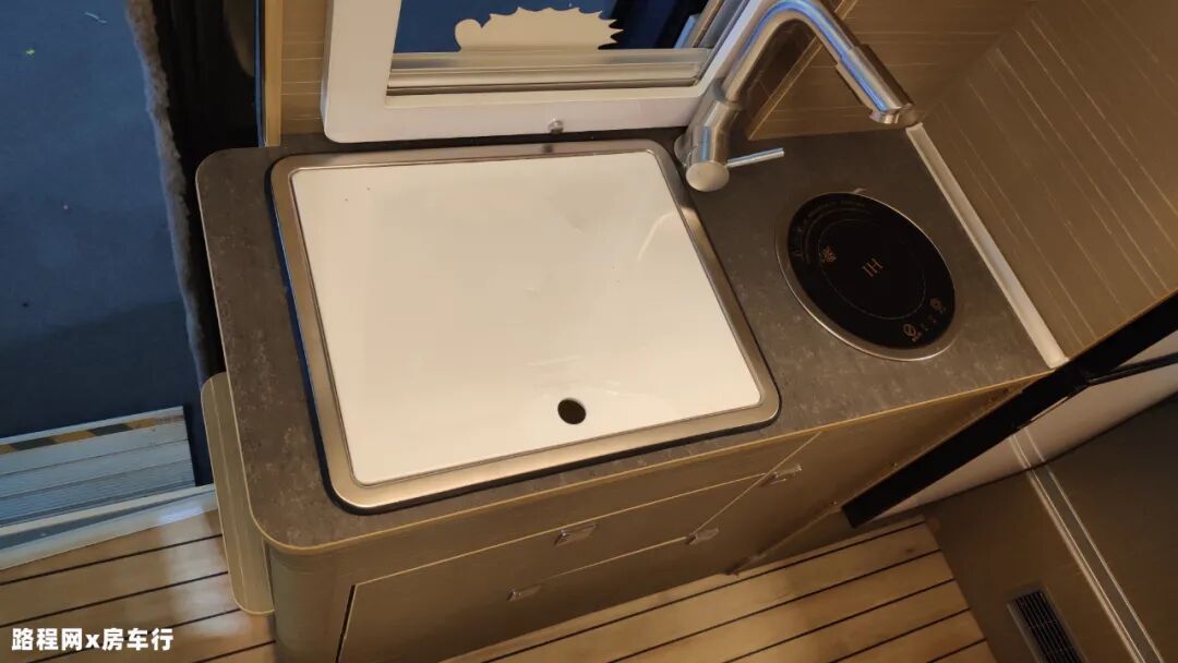 右侧厨房区采用了一体式橱柜的设计,配置了带砧板的不锈钢洗菜池,不使用时可当做操作台,侧方设有折叠小桌板,可操作面积进一步增加;旁边设有水龙头、电磁炉,下方设有抽屉、储物柜等设施,满足车上烹饪的使用需求;
