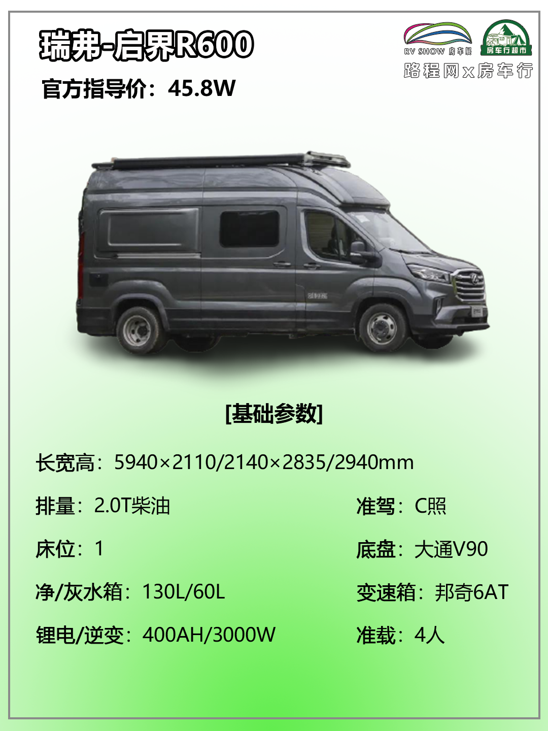 水电方面,瑞弗启界R600标配130L清水箱、60L灰水箱、12V 400AH锂电池、3000W逆变器等设施,同时也可加装325W/610W太阳能充电板增强续航;水电不算太多,但对于短期旅行来说还是够用的,毕竟这款车从本质上来说依然属于B型车,但这么帅的外观,可媲美C型车的舒适,如果你不喜欢C型车又想要有C型车一样的旅居体验的话,这款车将会是你不容错过的选择;目前这款车官方指导价为45.8W,各位看官觉得这款车怎么样呢?欢迎下方评论留言!