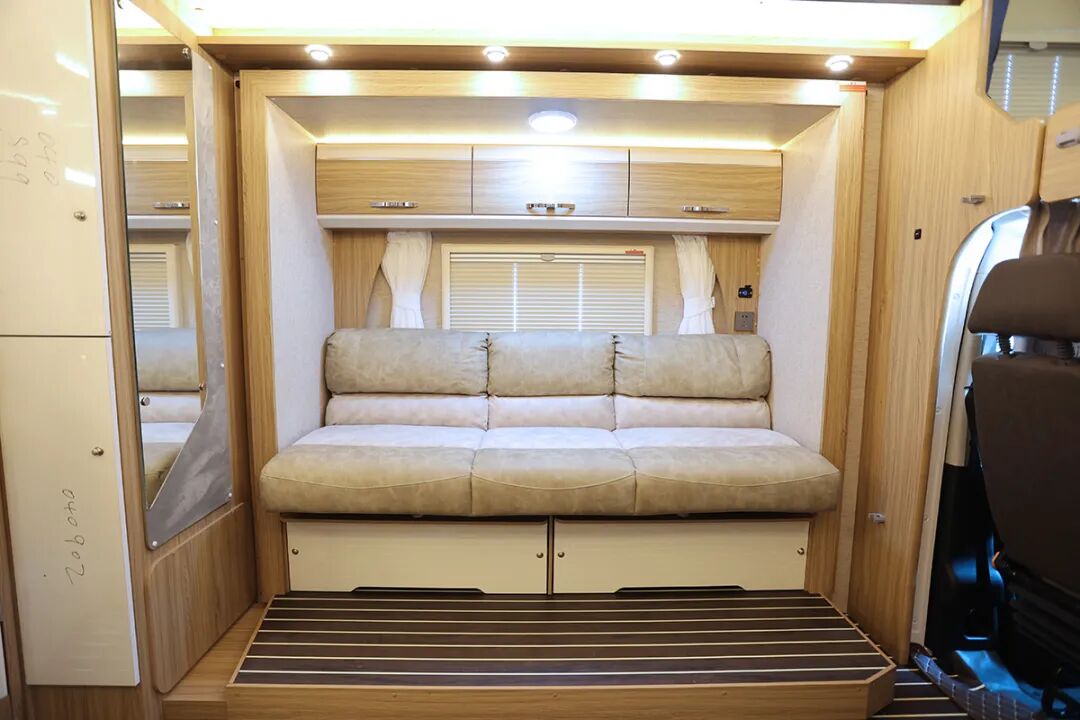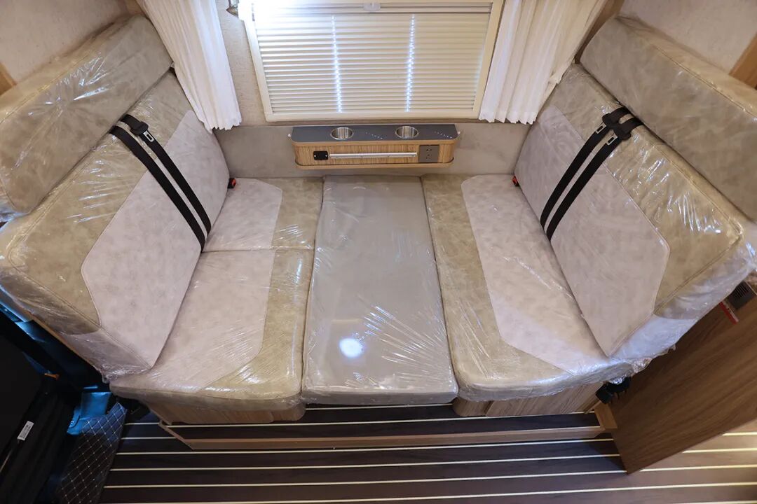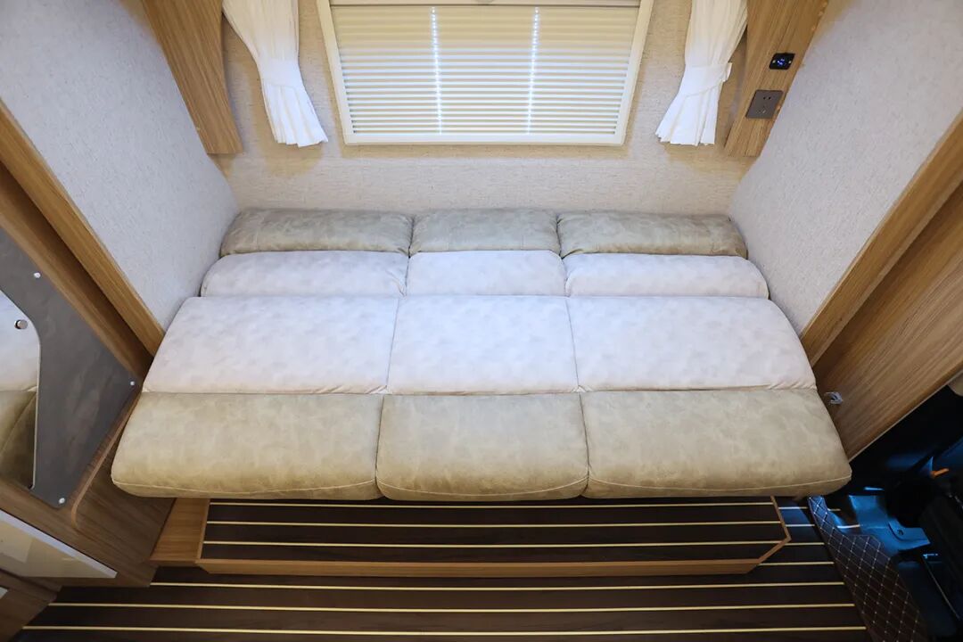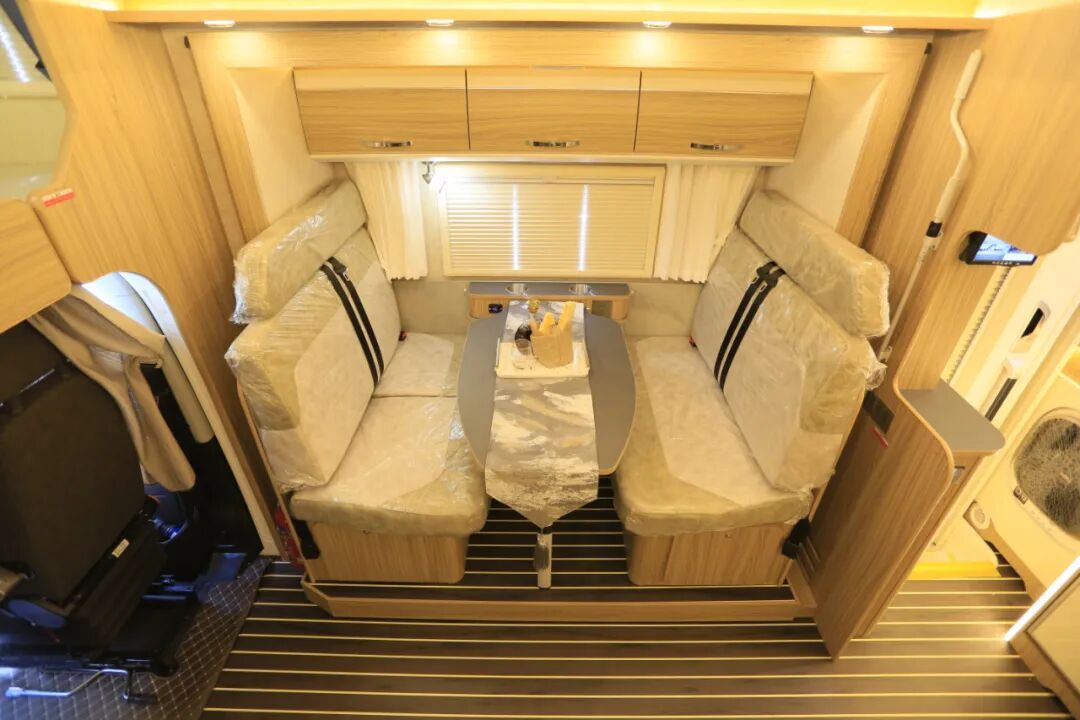 由于独特的对向双拓展结构,车内生活区布局也是比较少见,客厅空间可以说是在同级别C型房车中少有,一侧是带餐桌的对卡座沙发,另一侧是三连坐大沙发,而且都支持沙发变床,空间没有浪费。