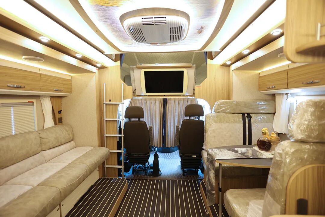 值得注意的是,全新一代尊领DT采用了同级独有的左右对拓展,停车露营时可将两侧的拓展舱打开,形成更宽敞的生活空间,全车滑移舱拓出后,总面积高达11㎡。房车底盘处配备了驻车支腿,避免露营时车内摇晃。