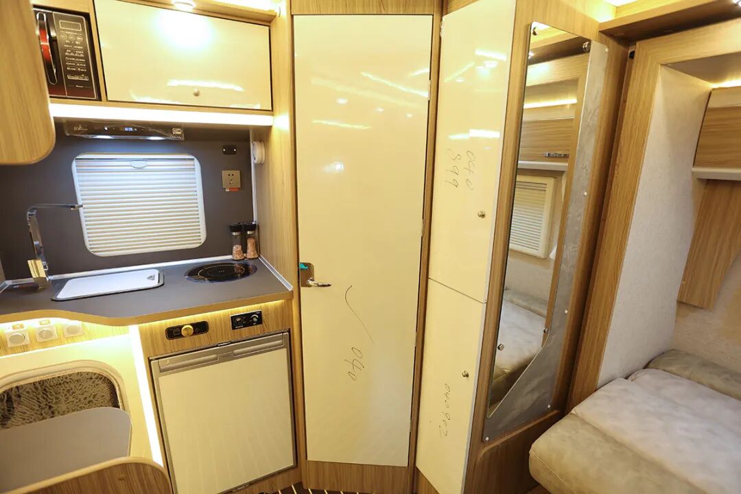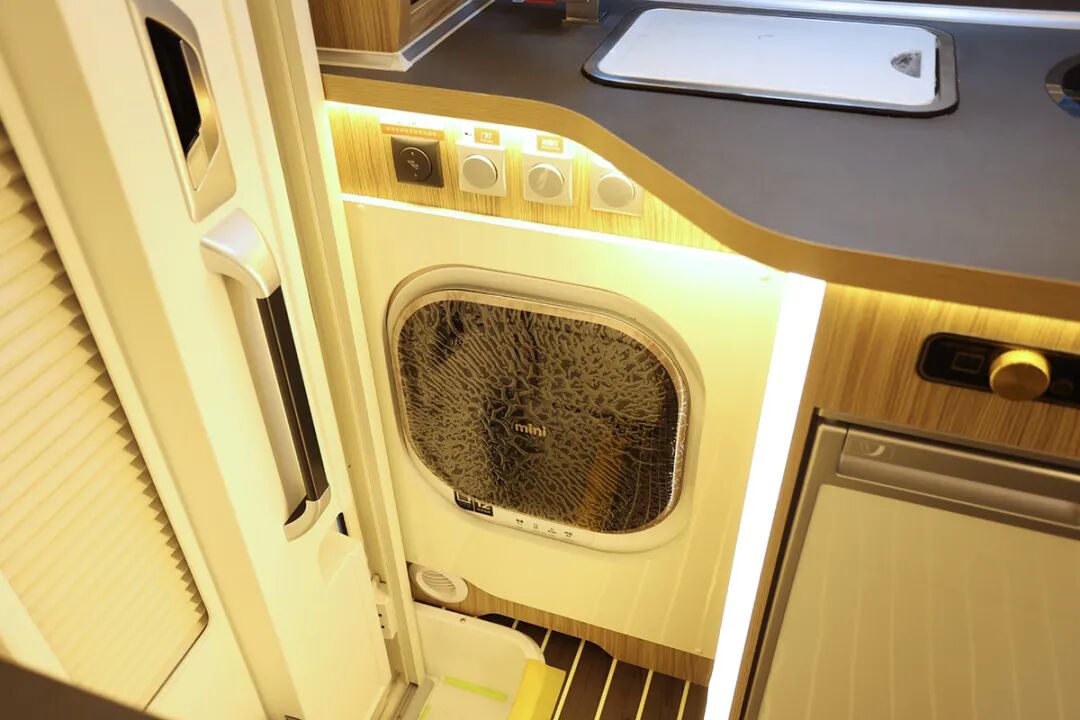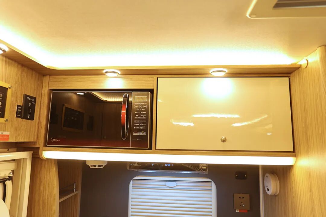 厨房桌面上配备了1200W志高电磁炉、110L瑞典进口多美达车载专用冰箱、城邦房车专用油烟机、2.5公斤韩国进口大宇壁挂式洗衣机、美的微波炉等电器设备。还配有带盖板洗菜池、美国进口科勒高弯水龙头,电源插座及空气报警器等。储物方面,厨房内侧3排带护栏置物架和顶部储物柜等,可以收纳调味瓶、厨房用房等。