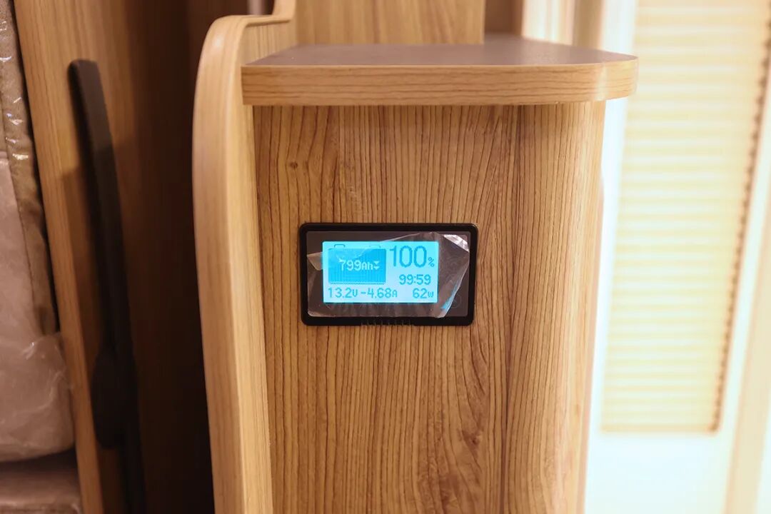 锂电池管理系统,可以查看剩余电量及电池状态,新车配备的是824AH磷酸铁锂电池(防水等级IP67级)及如果新能源500W单晶硅太阳能硬板。