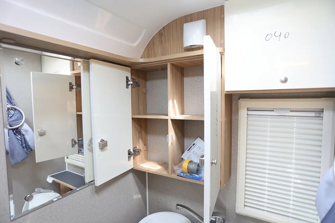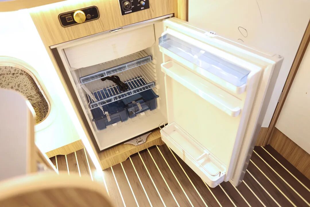 卫生间顶部为意大利进口菲亚玛换气扇,还设计了多组储物空间,可以收纳洗漱用品。储物柜上方设计了一个电源插座,可以使用电吹风,带有防溅盖。当然,最贴心的还是卫生间内也设计了暖风出口,冬天洗澡不那么煎熬了。细节处,花洒的水管带有固定装置,可以避免车辆行驶中,水管和墙壁磕碰产生异响。
