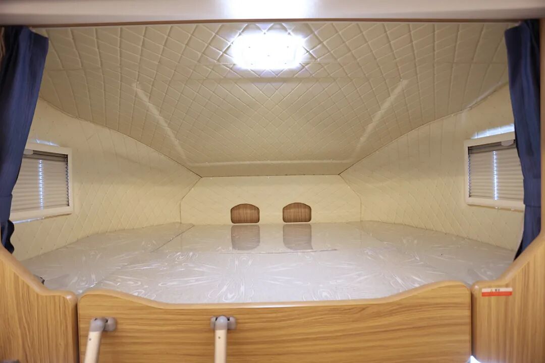驾驶室上方配备了32寸车载智能电视,将内嵌有电视的床板放倒后,一张2200×1470(mm)的双人床就出现了。床位两侧有外推窗,可以打开换气,也带有遮阳帘及防蚊帘。床位两侧墙壁上设计有阅读灯及USB充电口,驾驶室上方的床位比较高,不过不用担心,随车配备了轻质铝合金爬梯。