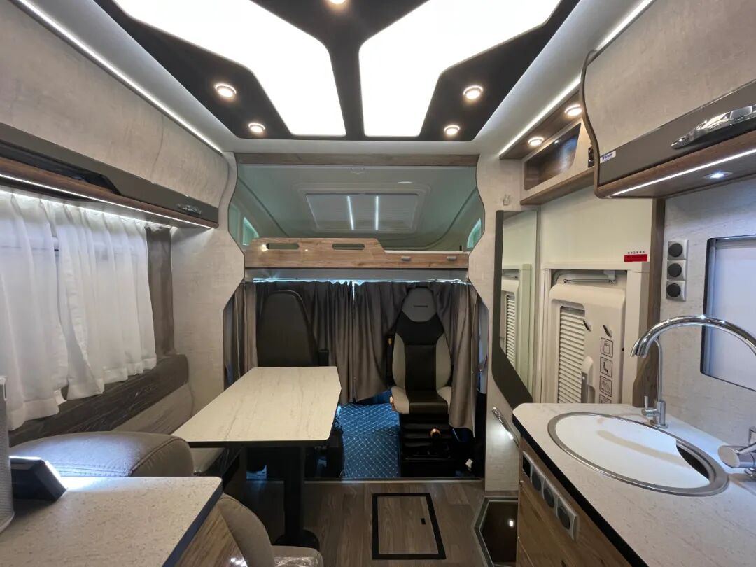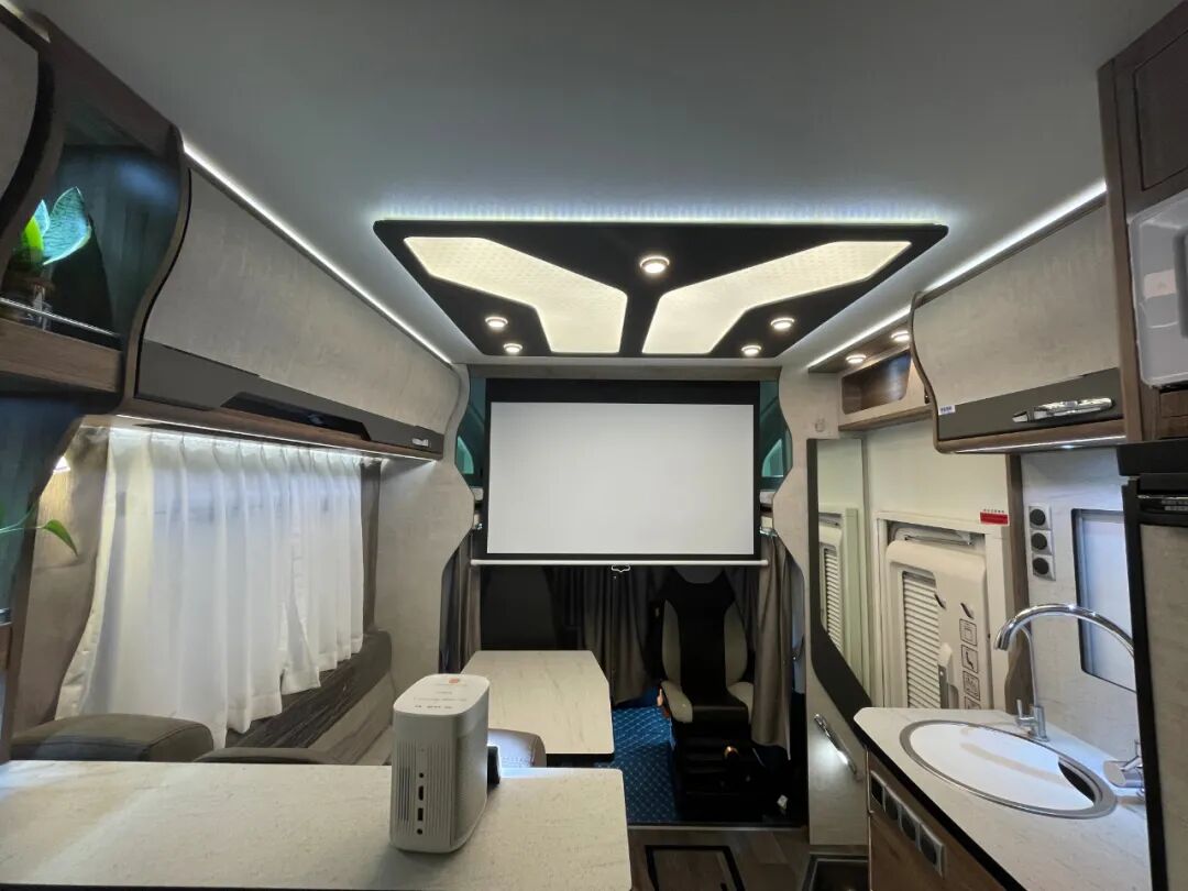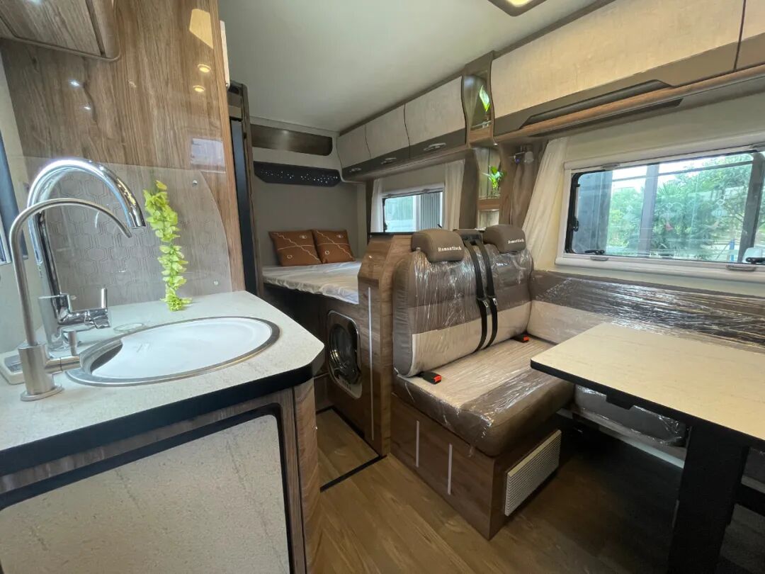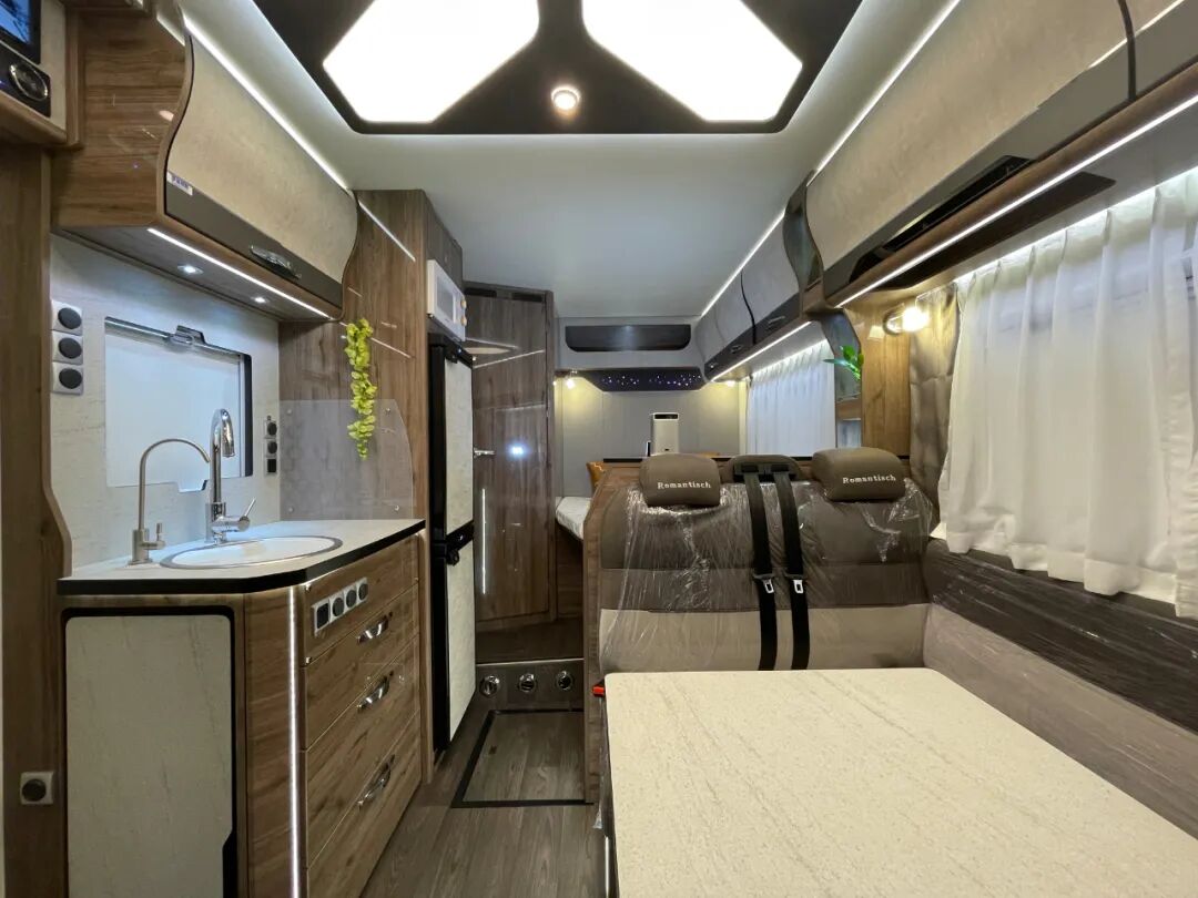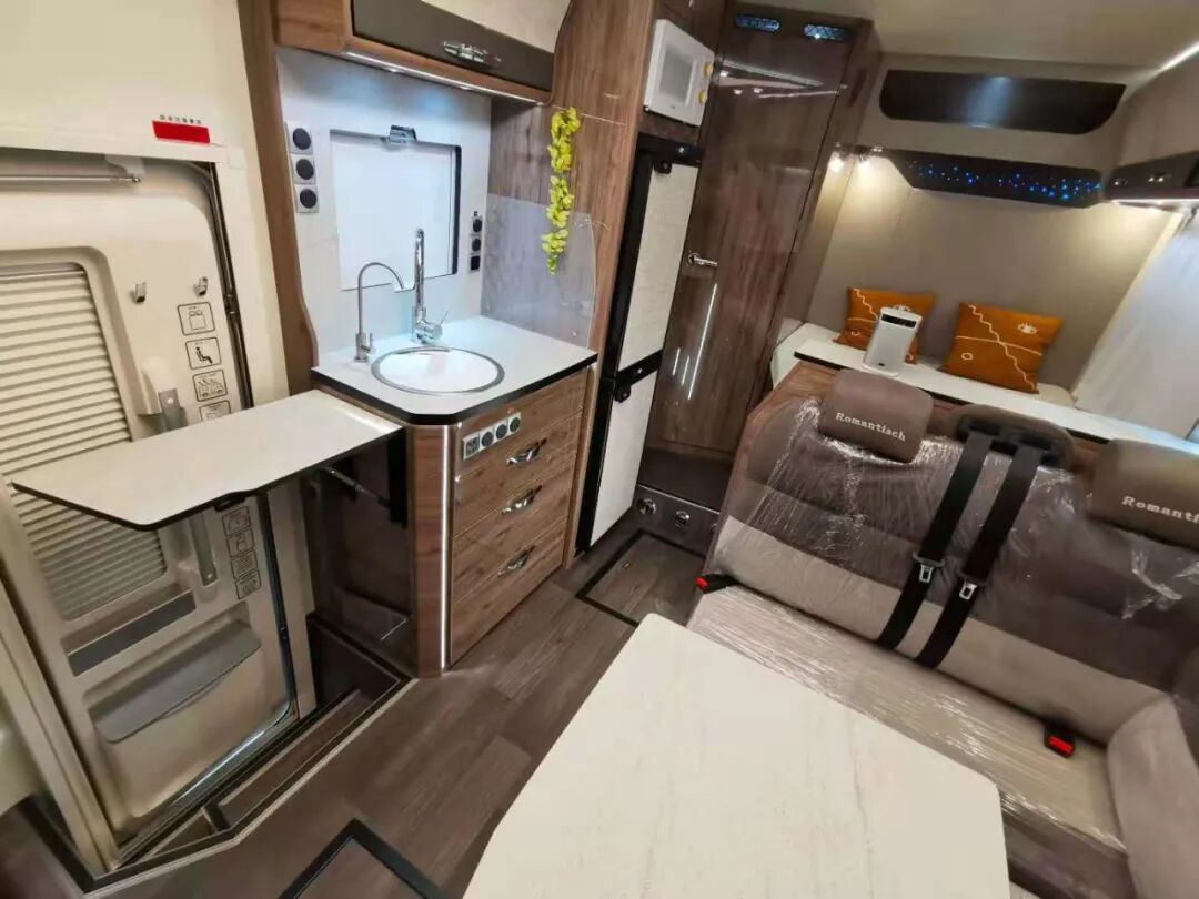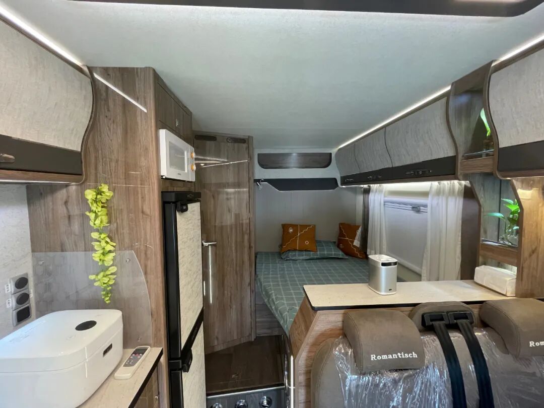 驾驶舱与后方贯通式的设计方便进出,同时配有隔断帘保护后方生活区隐私;内饰方面,这款车提供了胡桃、深灰直纹、浅灰直纹三种风格可供选择,内部家具采用E0级环保板材,搭配进口房车地板革、顶部氛围灯带+背景灯+照明灯,营造温馨舒适的居住环境;