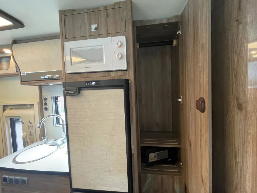 与厨房区搭配使用的还有一台英得尔152L双分区冷藏冷冻可调温冰箱,长途旅行时可用于储存大量食材,当然用于冷藏饮料也是个不错的选择;冰箱上方配有韩国大宇微波炉,顶部储物柜;