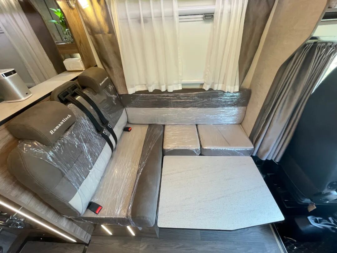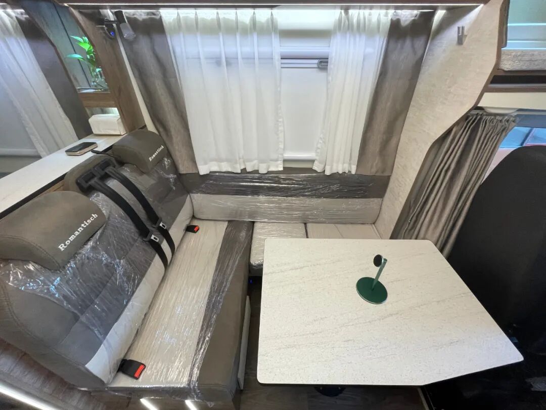 会客区在主驾驶位后方,采用L型沙发卡座的设计,选用进口房车专用面料提升乘坐时的舒适度,同时配有两条安全带方便行车途中载人,另可选装第五座椅,容纳人数进一步增加;座椅下方设有储物空间,可用于放置小件物品;