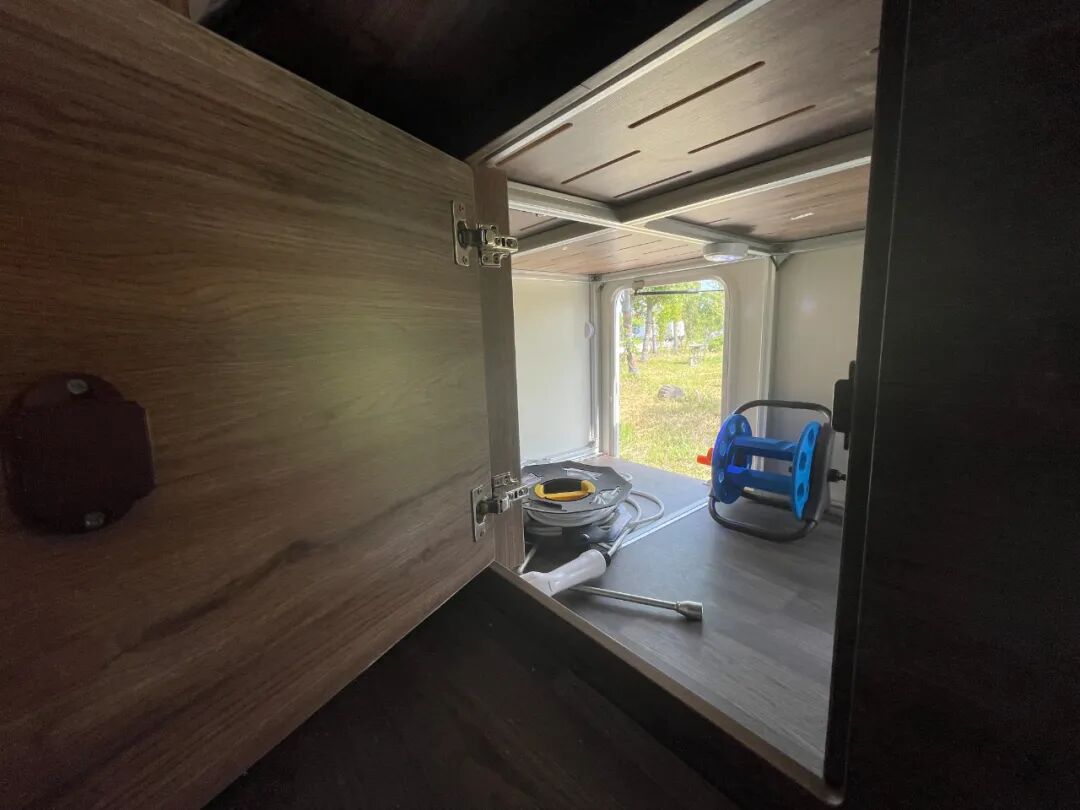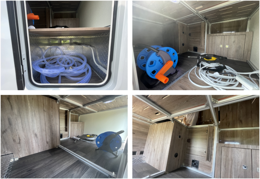置物台左下方设有户外淋浴,方便户外清洗物品,也可搭配户外厨房做饭使用;当然,如果想在车外洗澡的话,也不是不可以,但注意保护个人隐私哦~
