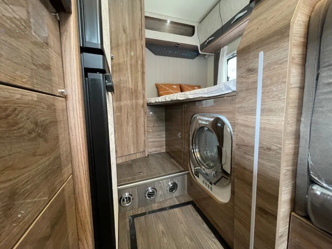 双人床侧方配有进口大宇2.5KG洗衣机方便旅行时清洗衣物;另外,细心的朋友可能已经发现了,洗衣机嵌入的位置略微往上,日常操作起来也变得方便不少;底部设有恒温暖风系统;