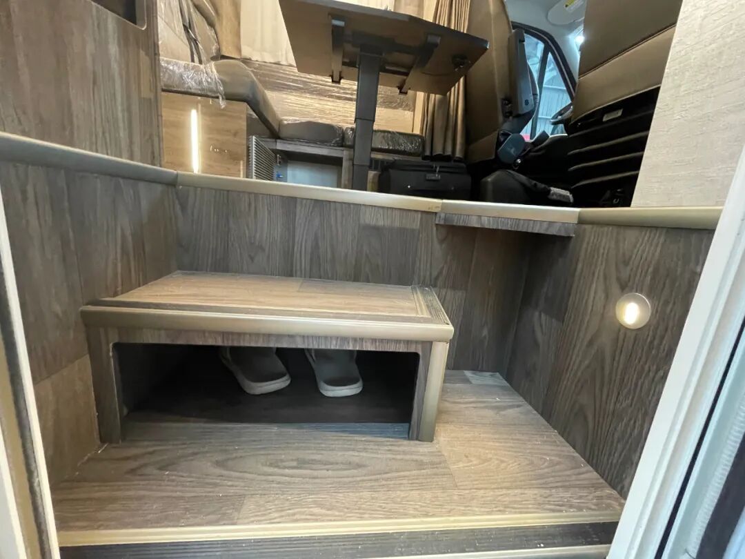 当然你也可以从右侧乘客主门进入,主门上车处设有多级踏步方便上下车,对于腿脚不方便的人来说可以说非常人性化的设计;中间踏步暗藏鞋柜,侧方照明灯方便夜间使用