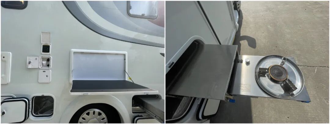 罗曼1号在乘客门左下方的位置配备了高原版抽拉柴油灶,搭配调料架、户外翻板,满足你在旅行时在户外烹饪的需求,同时也可有效防止车内油烟泛滥的问题;