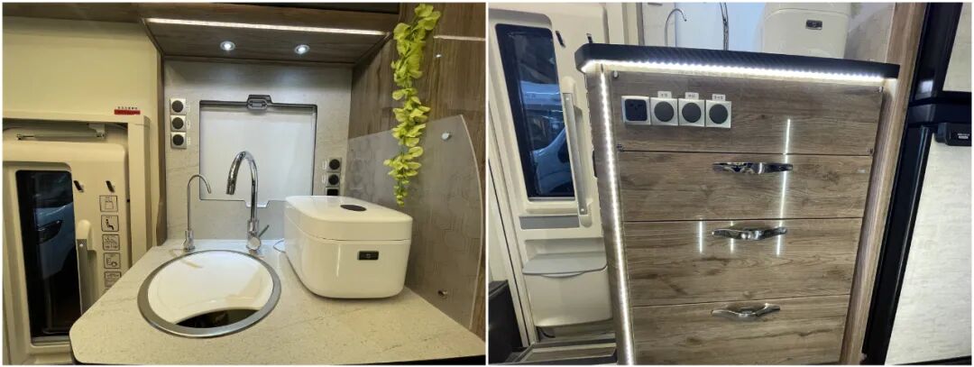 厨房采用一体式橱柜设计,并在侧方加装了拓展操作面板,用来放置物品或者料理食材都是不错的选择;厨房内部配备了带盖板的洗菜池、大弯冷热水龙头、净水龙头、储物吊柜、欧洲房车专用开关插座、亚克力防水板(右侧)、抽屉、电器开关等设施;