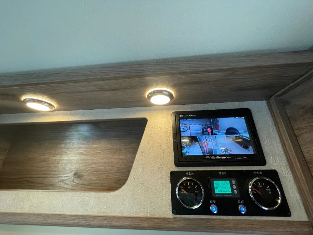 车身外部配置了瑞典多美达进口户外遮阳棚、房车专用车门+舱门+窗户总成、户外照明灯、太阳能照明灯、黑水箱、电动踏步、户外防水插座、户外七孔充电插座、15米加水管、220V外接电源充电线(15米)、驻车支腿、重力加水口(自带12V插座)配水泵、新能源充电口、市电充电口等设施,看起来相当的丰富;