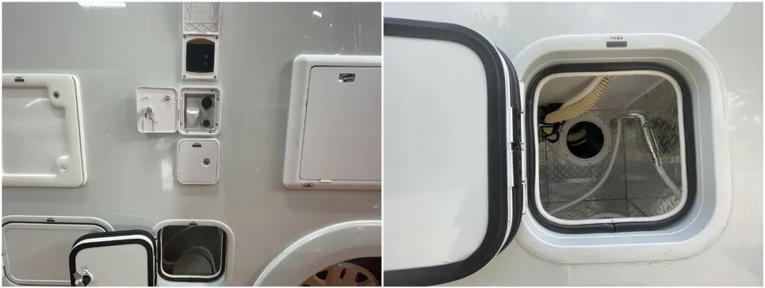 另外,该储物空间采用内外两用的设计;车外可从车身左侧中部、尾部的舱门进行存取;车内的舱门则位于双人床处;