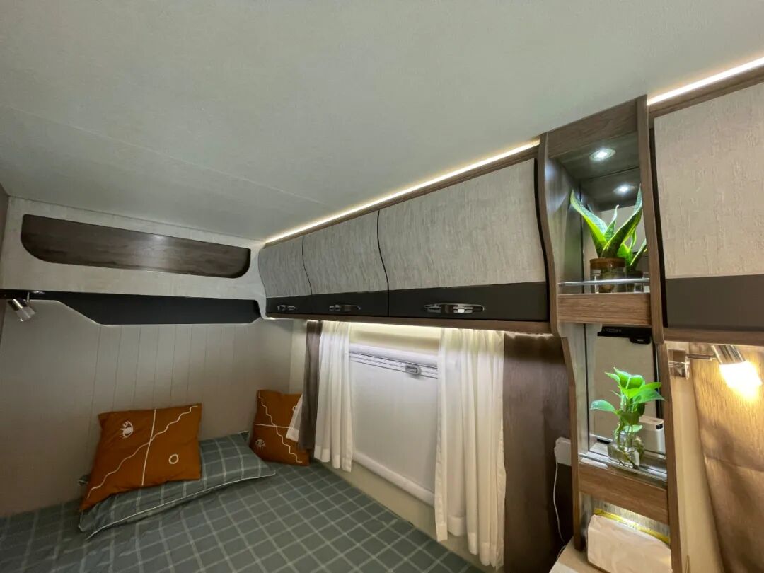装饰方面,床头处采用了劳斯莱斯同款星空背景,豪华多一点,舒适多一点;侧方大尺寸外推窗,带有窗帘、隔断帘,在采光、通风、观赏风景充分满足的同时,有效保护内部人员的隐私;顶部多组储物吊柜进一步增加储物空间;此外,床头处还配备了阅读灯、充电接口等设施方便夜间休息时使用;