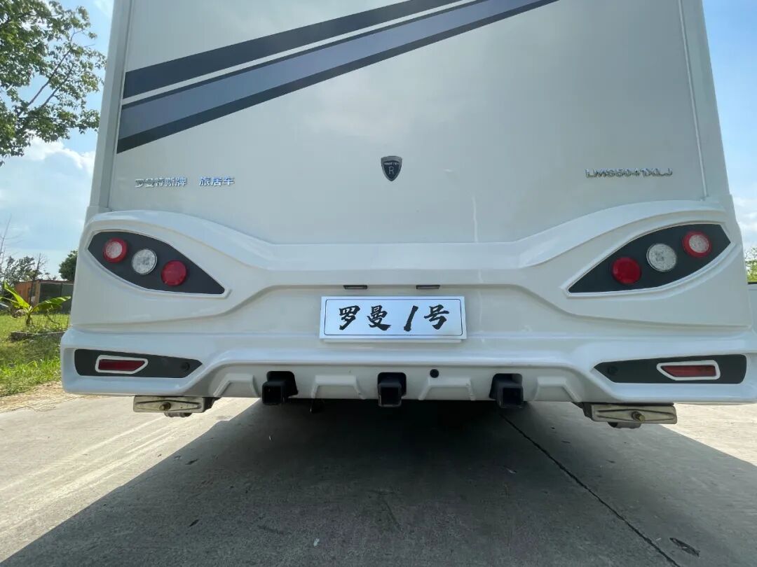 车尾底部的位置标配了一体式三孔拖车杠和驻车调平支腿,并配备国标拖车接线插头;