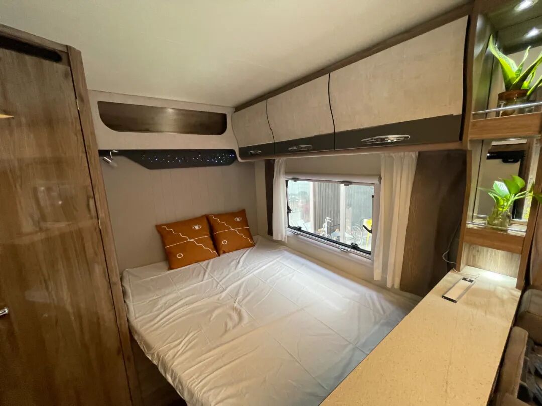 尾部固定休息区纵向放置一张双人床,尺寸为1950x1300mm,空间充足,可供多人睡眠,另提供双层子母床可选装,睡眠空间进一步增加;