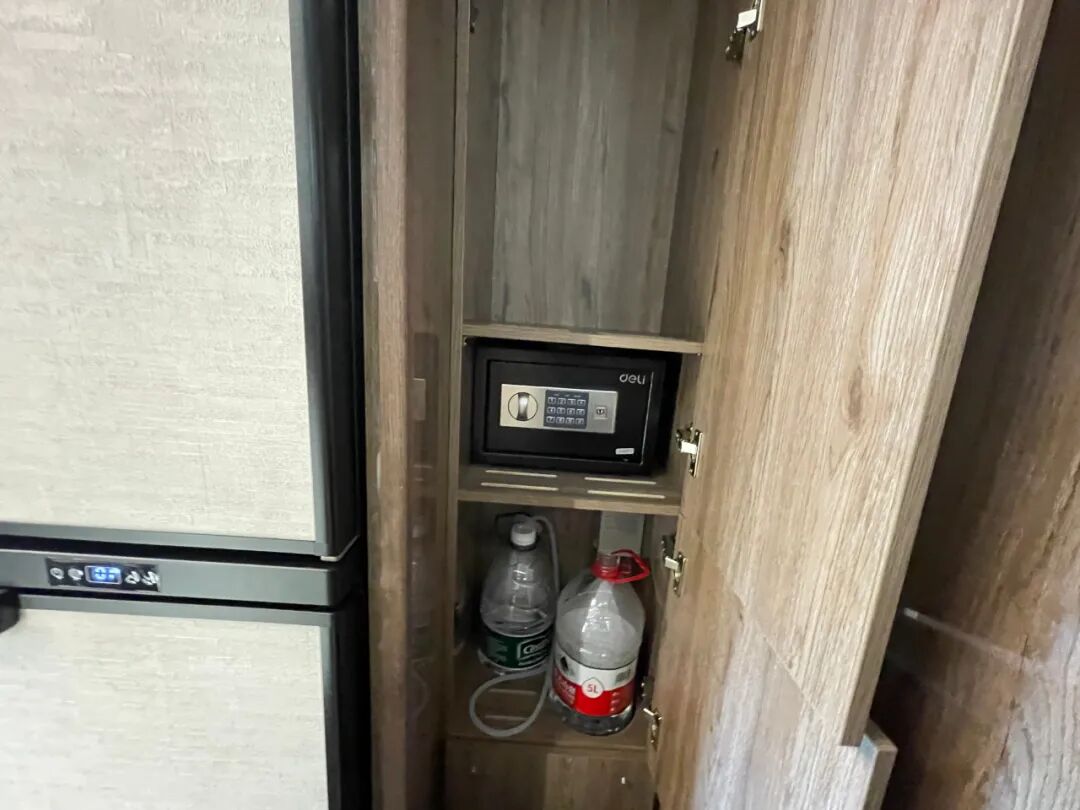 衣柜中部配置了一个小型保险箱,可用于保管一些比较贵重的物品;底部是净水放置处,与净水龙头搭配使用;