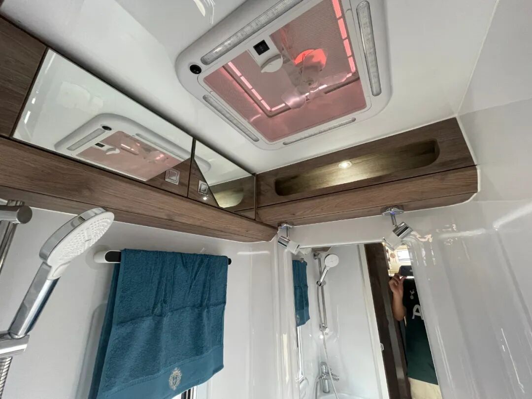卫浴间采用整体ABS开模吸塑一体成型的设计,干湿一体,配有赛特福德盒式马桶、洗漱池、独立淋浴花洒、冷热混合水龙头、浴镜、毛巾架、照明灯、储物柜、储物格、暖风出风口等,充分满足车上人员的卫浴洗漱需求;