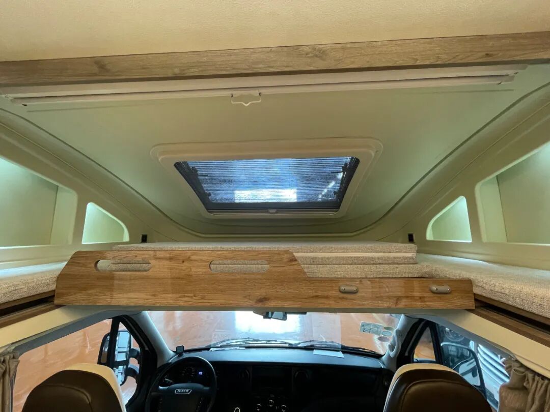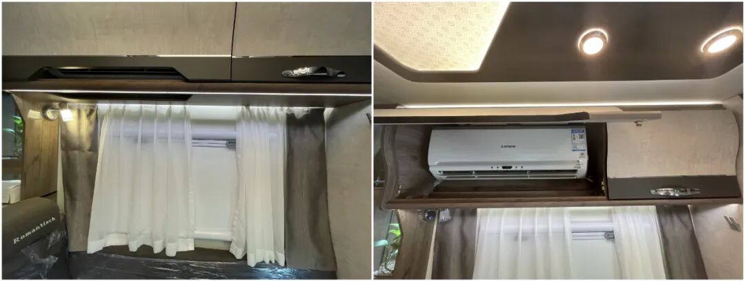 侧方设有大尺寸外推窗,配有纱窗、窗帘防止蚊虫侵袭,同时有效保护车上人员的隐私,私密性更强;顶部设有德国菲林格尔S型弧度整体吊柜,右侧储存日常用品,左侧吊柜则内嵌一台三菱家用变频空调;