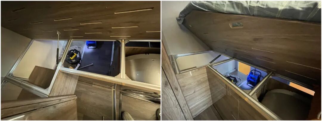洗衣机旁边是储物舱的小舱门,而将双人床的床板整体向上翻起,底部同样与储物空间相连;多舱门的设计日常使用起来方便不少,需要什么直接拿,再也不用跑上跑下了;