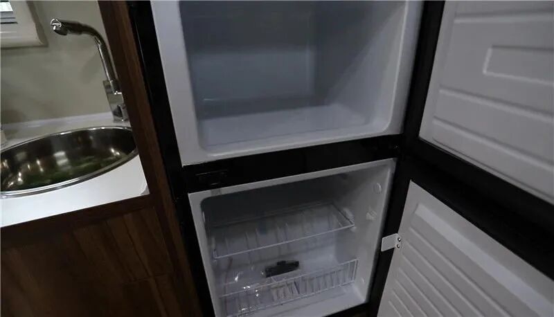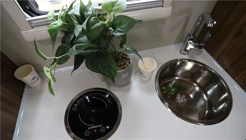 厨房区设备齐全,配有900W电磁炉,不锈钢水盆,水龙头、微波炉、85L冰箱和220V电源插座,能够满足旅途所需。上方配置吊柜,方便存储餐厨物品。操作台上方另安装了一个小顶灯,不用担心晚上光线差影响做饭。
