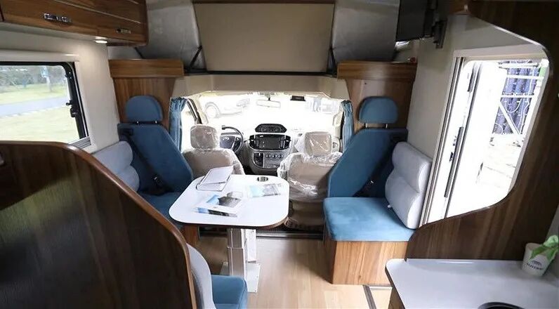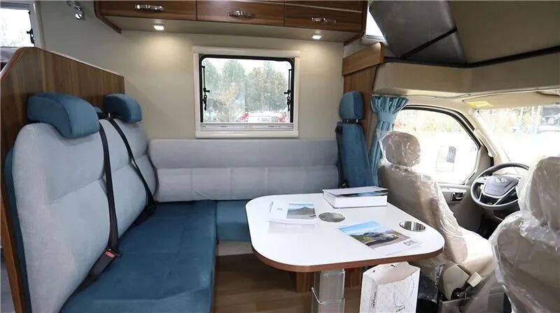 客厅为L形布艺面料环形卡座+升降式餐桌的布局,可拼成一张单人床。卡座上方配有吊柜,可存放出行所需物品。与多数C型房车不同,这款车的电视不是配置在额头床下方,而是在会客区右侧,24寸的可移动电视,方便乘客在车内不同区域观看。