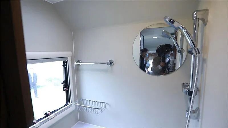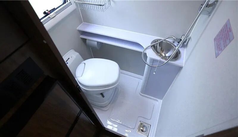 卫生间空间较为宽裕,内部设施十分完善,配有淋浴花洒、不锈钢洗手盆、化妆镜、换气扇、毛巾杆、马桶、置物架和卫浴帘等。另有独立燃油加热器,冬季洗澡也能舒适便捷。