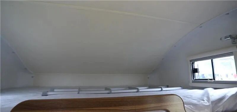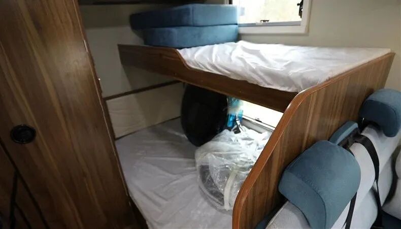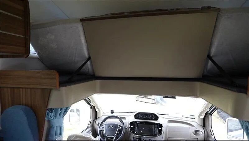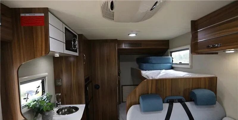 车尾睡卧区采用母子床的设计,上床为单人床,可满足一名成年人休息;下床为一张双人床。床侧配有外推窗和遮光帘,顶部装有储物吊柜和空调出风口,为睡眠提供舒适的环境。