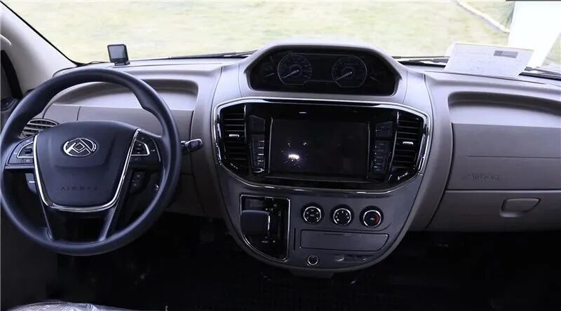 乘客门为手动伸缩踏步,使用简单。进入车内,内饰黑胡桃风格,沉稳雅致,可定制浅色内饰风格。驾驶室配置定速巡航、多功能方向盘、胎压监测、ESP、HHC、电动加热加宽外后视镜、倒车雷达等。还配有遮光帘,保护车内隐私。副驾驶可手动向后旋转,方便与会客区乘客交流。