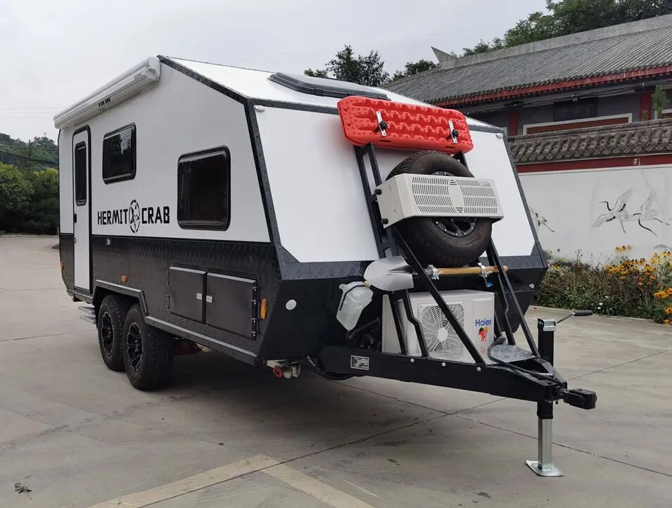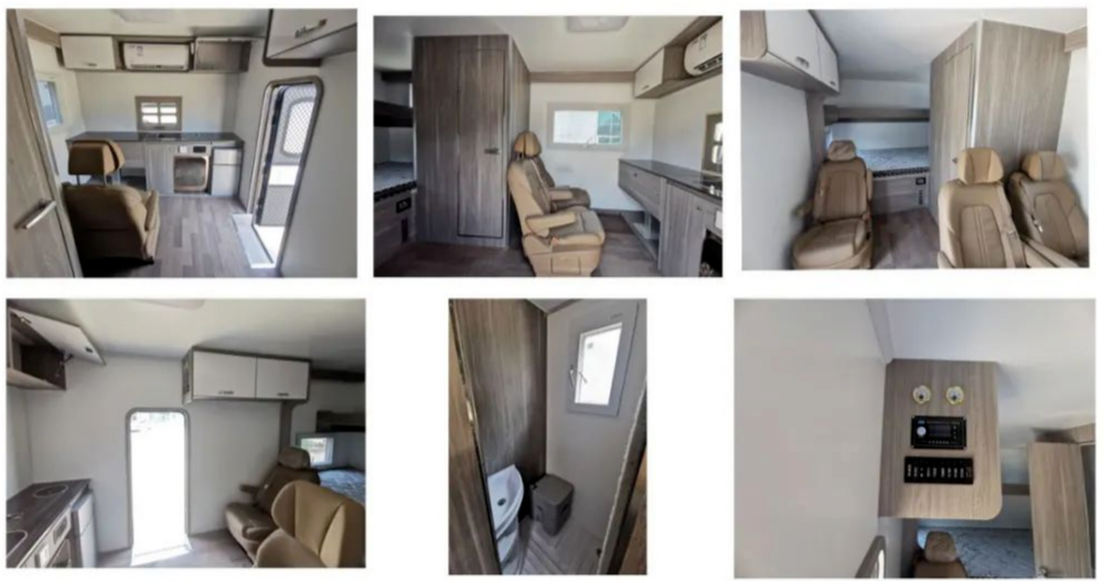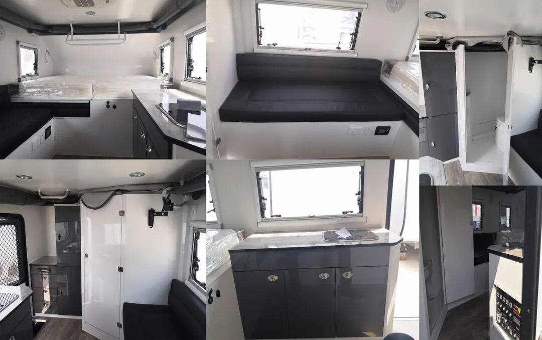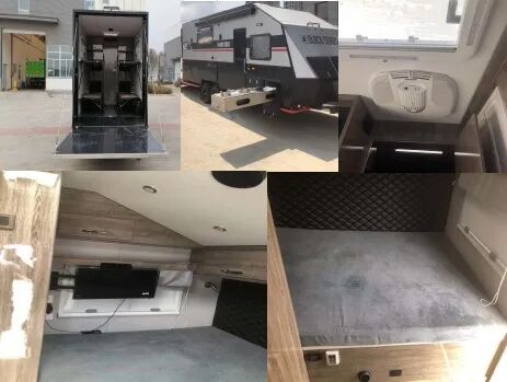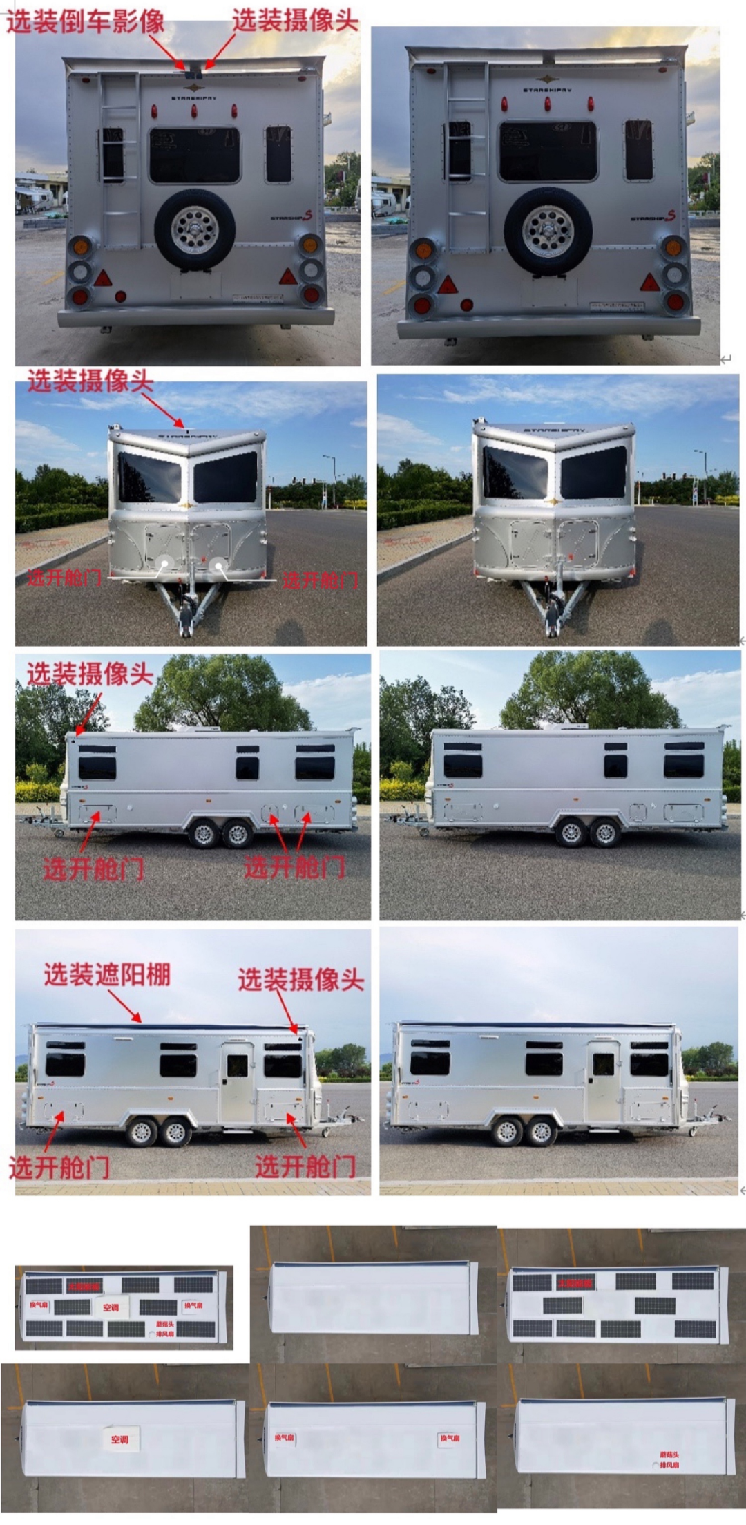 选装描述:1;车厢顶部封闭,不可开启,2;本车为非乘用车,行驶过程中不载人,3;厢体内安装有床铺桌柜卫生家电炊事等设施, 4;根据内部布局选装舱门位置及大小, ;5.中置轴挂车的牵引杆深入量(mm):40;6.中置轴牵引杆连接器最大负荷(kg):150;