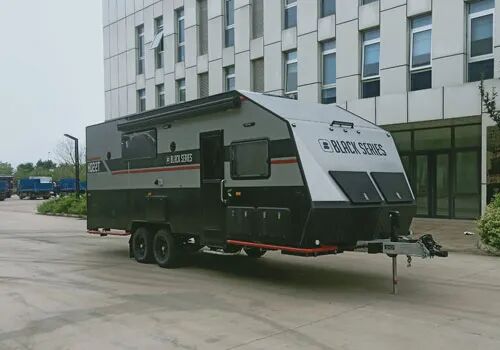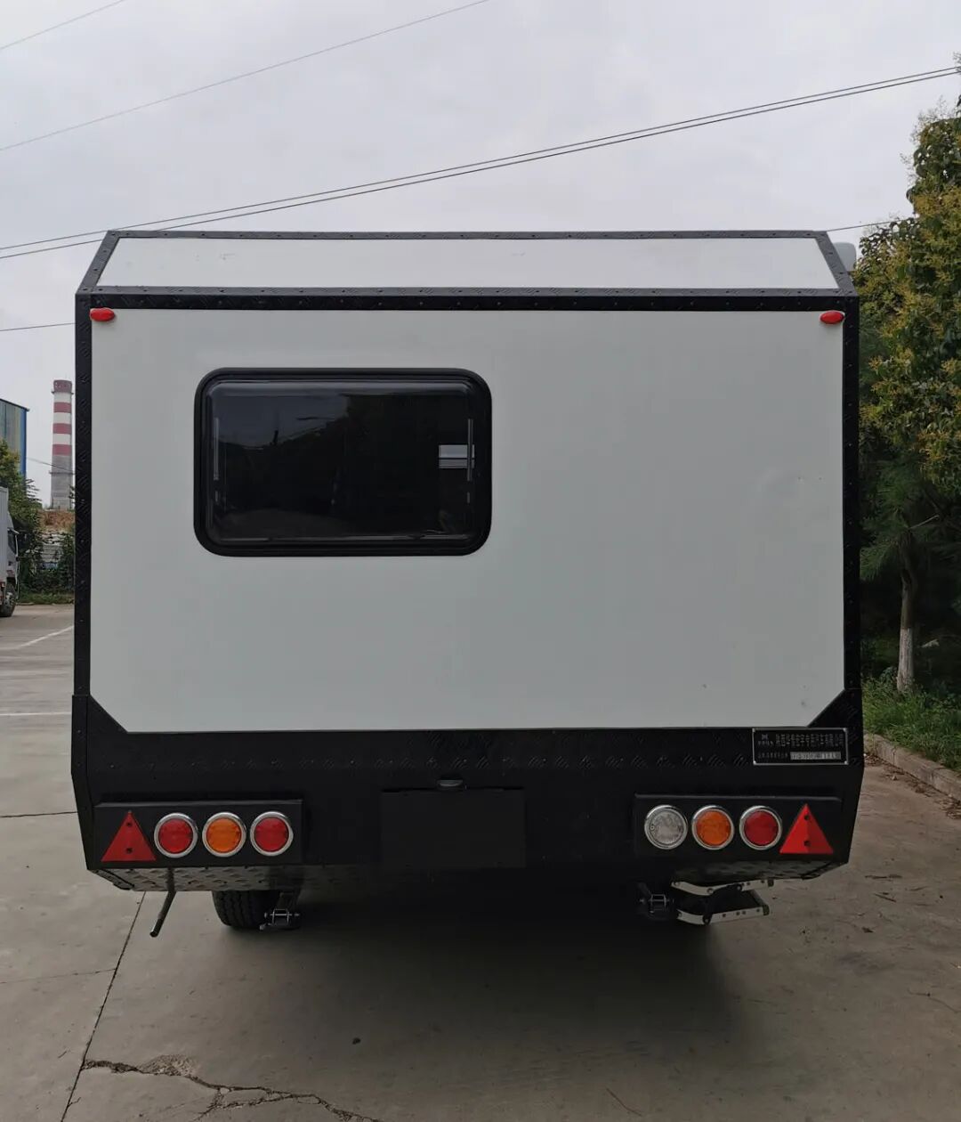 1、顶部封闭不可开启;2、顶部选装空调对应高度2800mm,换气扇对应高度2640mm、蘑菇头排风扇对应高度2590mm、遮阳棚对应高度2630mm;3、根据内部布置选装开窗位置及大小,选装门的开启位置,选装舱门位置及大小;4、选装遮阳棚;5、牵引杆深入量60mm,连接器最大负荷250Kg;6、该车为非乘用车,行驶状态中不载人;7、箱体内安装有床铺,桌柜,厨具,卫生设施等专用设备;8、车身采用裙边结构为铝制材料(QN-50P),后防护离地高度450mm。