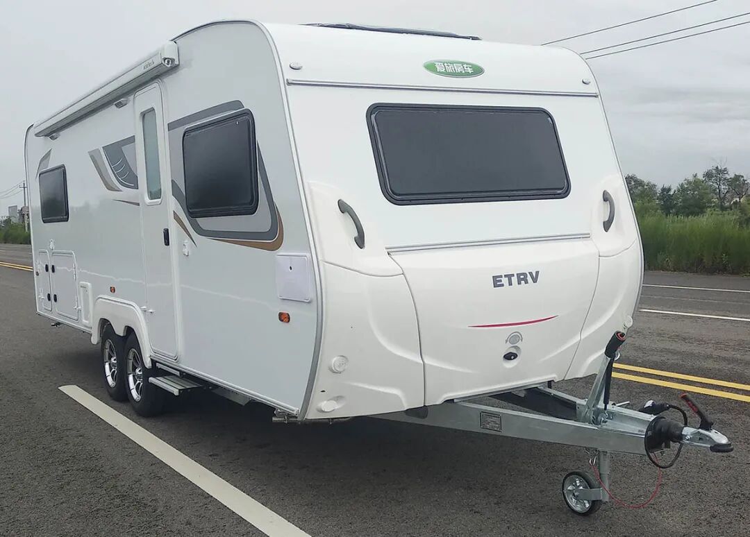 1.顶部封闭,不可开启;2.牵引杆深入量为30mm,连接器最大负荷260kg;3.厢体内安装有床铺,桌柜,卫生设施及娱乐设施等;4.该车非乘用车,行驶过程中不载人;5.可选装遮阳棚、卫星天、换气扇、太阳能板.6.选装卫星天、换气扇、太阳能板时整车高度为2750mm.