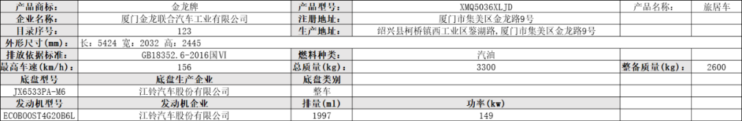 金龙牌XMQ5036XLJD型旅居车是在已公告的江铃全顺牌JX6533PA-M6多用途乘用车基础上,拆除乘客座椅,加装旅居专用装置,其他不变而成的专用车新产品。该车设有桌椅、睡具、卫生设施等设施;该车可选装单侧遮阳蓬,ABS型号EV5051,生产企业:博世汽车部件(苏州)有限公司;ECOBOOST4G20B6L发动机最大净功率147kw;可选装直接供电式ETC车载装置;