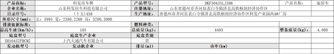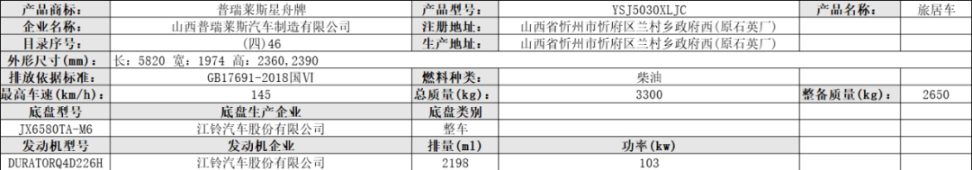 该车专用装置由卧具、餐具、卫生设施、座椅等组成,是用于旅居的专用车辆;车辆侧、后防护均采用裙边结构,后防护离地高470mm;ABS系统控制器型号:BOSCH ABS9、BOSCH ESP9,ABS系统控制器生产企业:BOSCH公司;发动机净功率值:装F1AE8481D发动机时,发动机最大净功率93KW;装F1CE8481K发动机时,发动机最大净功率123kW;装F1AE8481D发动机油耗11.3,装F1CE8481K发动机时油耗10.7;