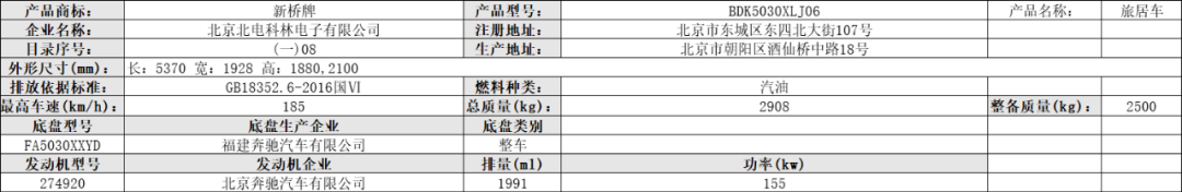 该车设有桌椅,睡具,炊具,卫生设施及必要的照明和空气调节等设施。睡具由座具转变而成。带OBD;2.ABS厂家:博世汽车部件(苏州)有限公司,ABS型号:ESP9;3.选装无前雾灯、前格栅、轮辋。选装ETC车载装置。5.发动机最大净功率为155kW。选装低顶高1880mm.