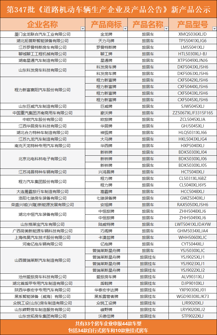 2021年8月11日,国家工业和信息化部在官方网站公示了第347批《道路机动车辆生产企业及产品公告》(以下简称《公告》)新产品。其中共有33家房车企业申报44款车型,包括34款自行式房车和10款拖挂式房车。