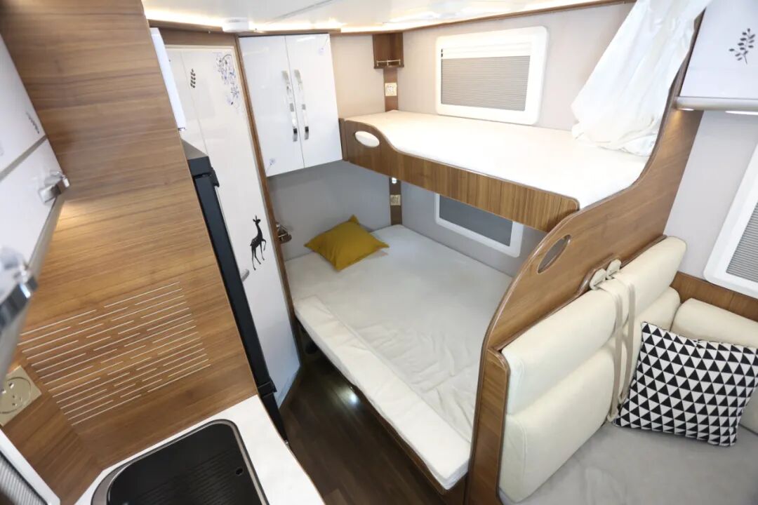 一家人外出旅行,沿途的山水风光真是让人流连忘返,但无奈旅行总会带着身体的疲乏,此时能躺在自己的床上美美的睡上一觉是一件多么幸福的事。今天我们来看一款带有子母床的房车,看看它是否能解决你的旅行痛点。