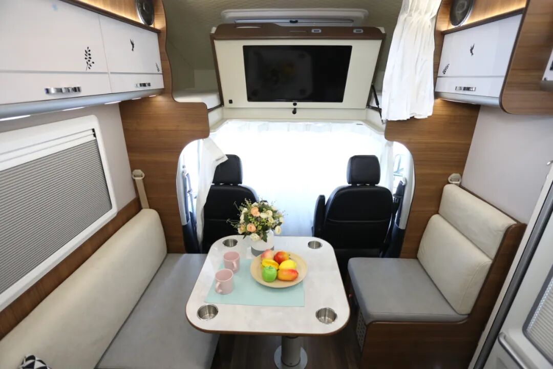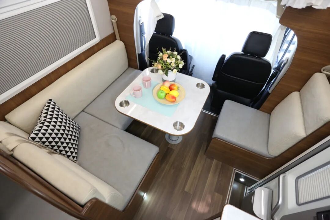 车内侧墙顶板采用PVC内饰板包覆,家具都达到E0级,地板是防滑地板革。会客区主要由L型沙发卡座+可升降餐桌组成。可升降餐桌设计有4个杯槽,放置水杯更稳固。
