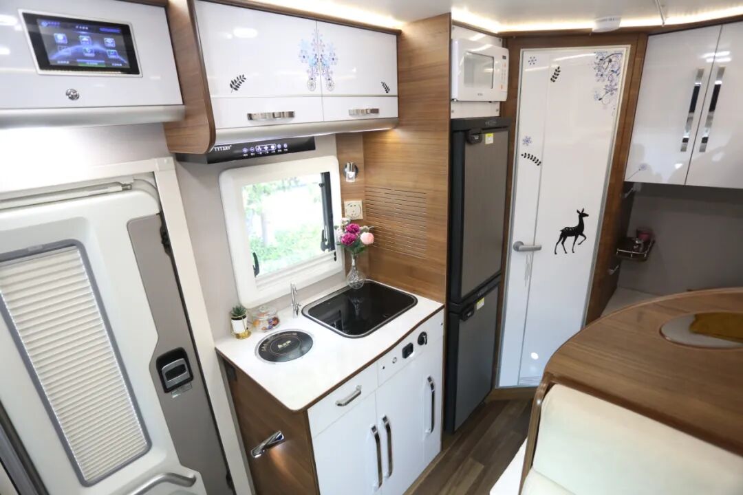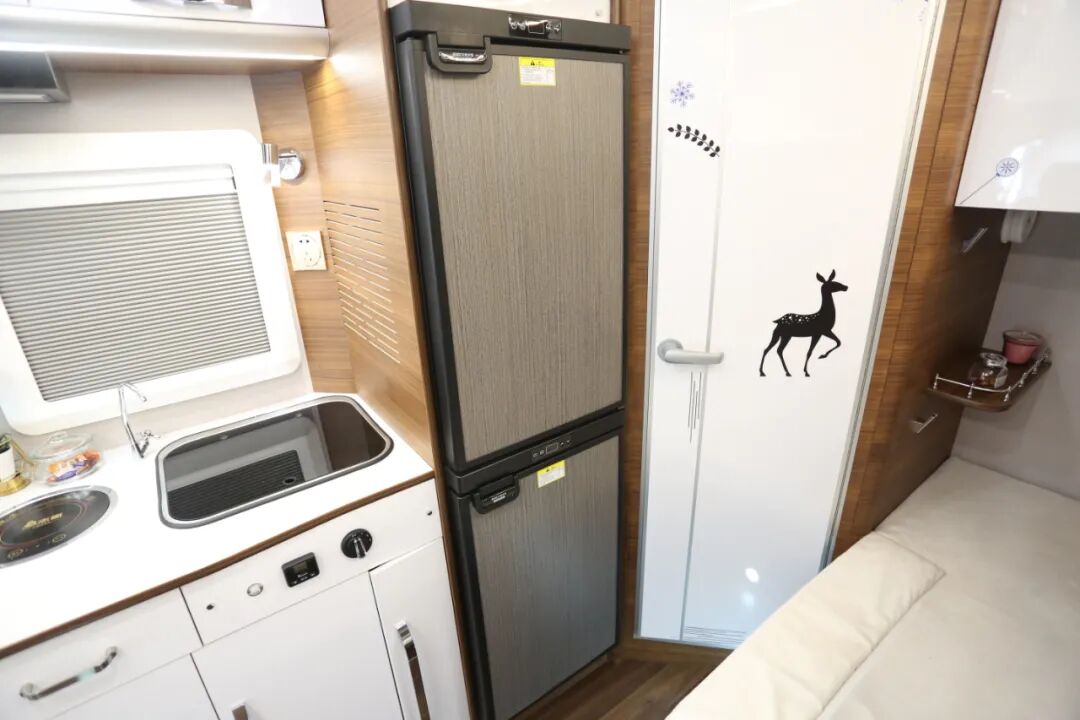 冰箱采用的是12V/71L房车专用车载静音冰箱,能够满足出行的冷藏储存需求。