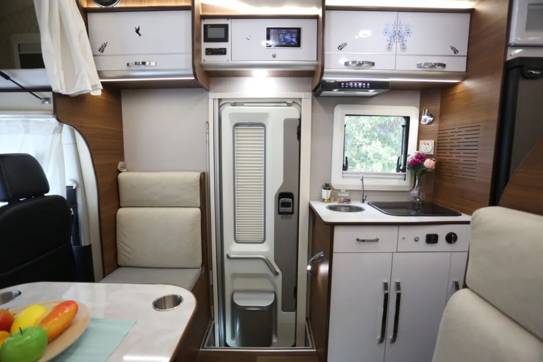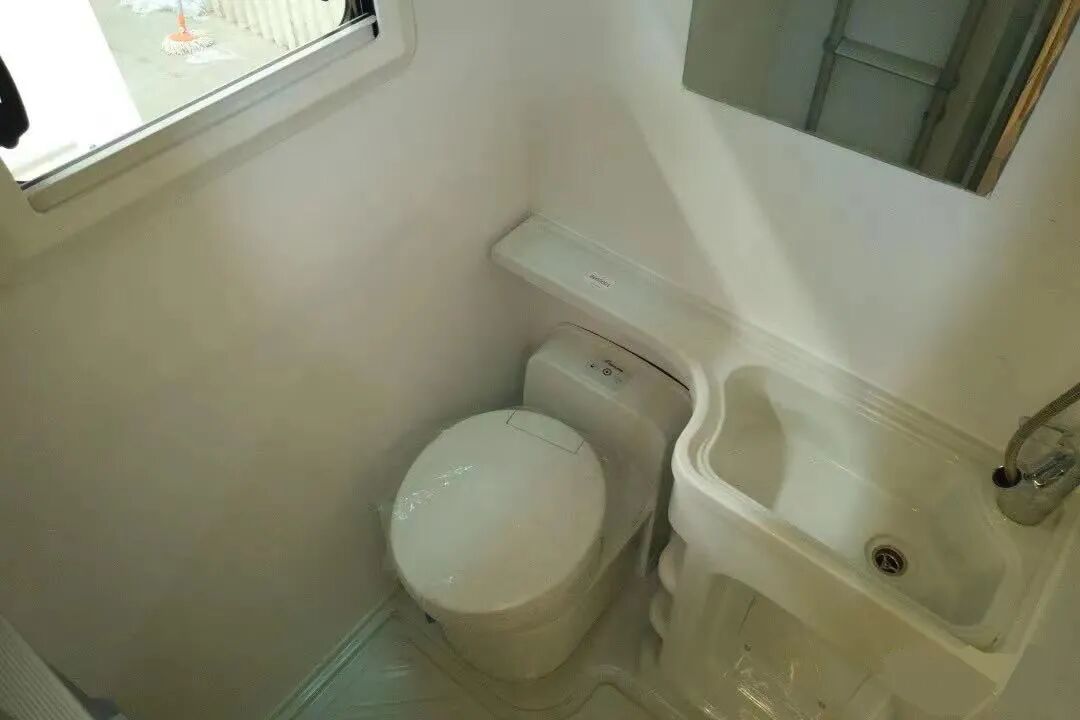 卫生间配备房车专用座便器,外置抽拉式黑水箱,淋浴花洒、洗漱池、10L博士电热水器等。