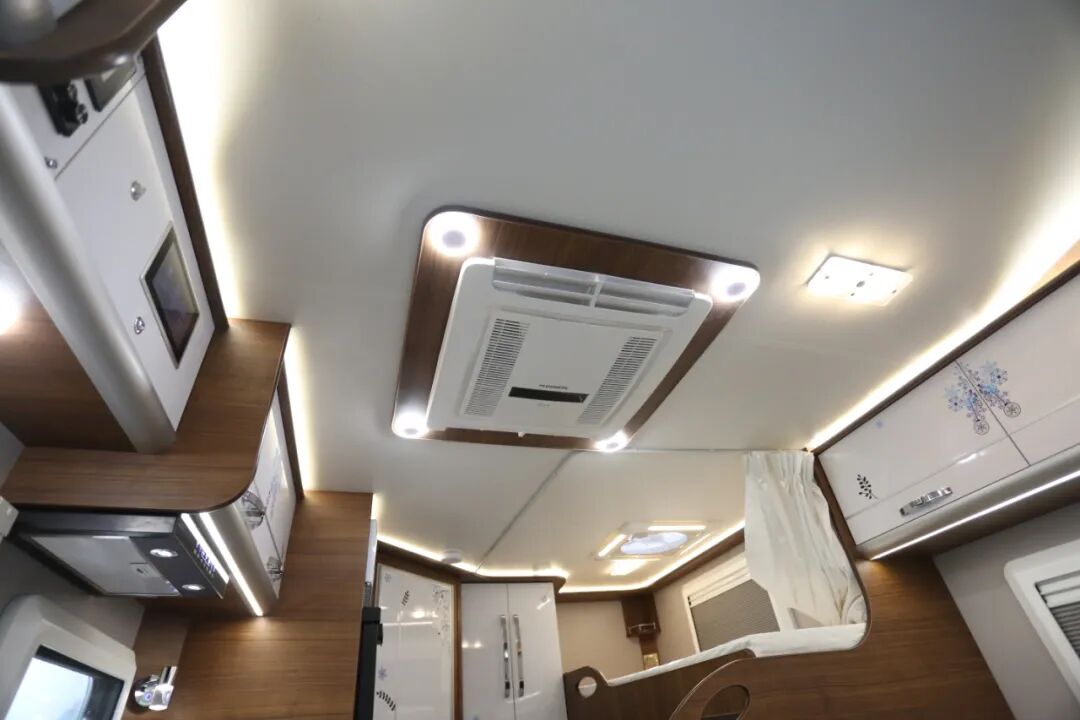L型座椅正上方、下方都有一排储物吊柜,可以收纳日常使用物品。会客区的上方还有32寸液晶电视、烟雾报警装置、LED氛围灯,空调也是采用了房车专用车载空调。