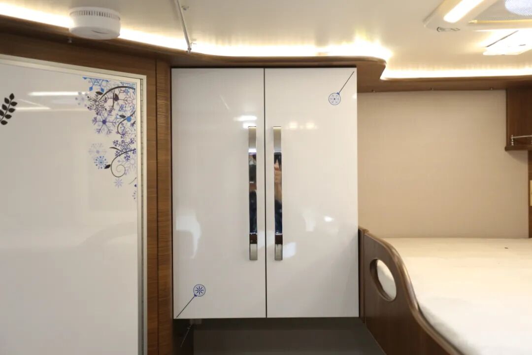 休息区:前额头横置1200*2200m双人床,两侧均带有通风窗以及超大天窗。后纵置1900*1250mm/1900*750mm子母床。满足4人休息。在床铺的上方还配有一个收纳柜,增加了物品的摆放空间。床头带有照明灯,侧边带有通风窗,保证室内空气流通性。