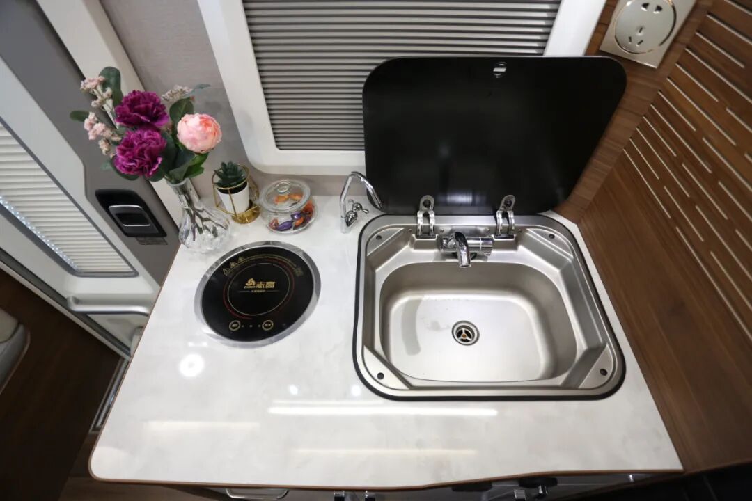 厨房区:台面采用仿石英石的材料,家电配置有微波炉、抽油烟机,洗菜池、冷热水龙头也是样样俱全,在外出行也能烹饪一顿属于自己的美食。
