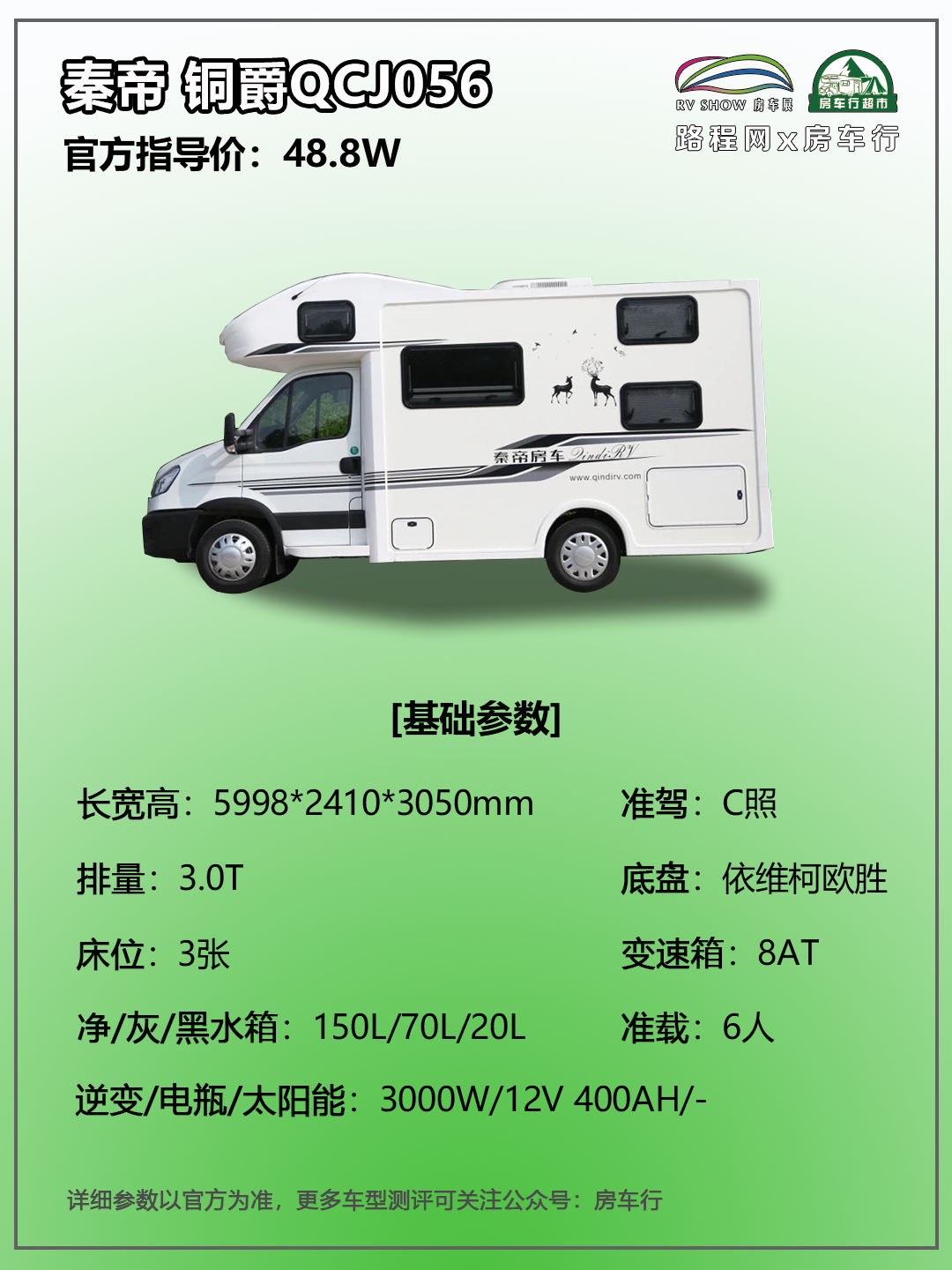 秦帝这款房车型号为铜爵QCJ056,标准的C型房车,外观大气、时尚。玻璃钢前额头+三明治车身,车身尺寸5998*2410*3050mm,轴距3300mm,高度超过3米所以铜爵标配了限高预警系统。最小离地间隙195mm,前麦弗逊式独立悬架、后非独立悬架;核载6人,C照蓝牌准驾。