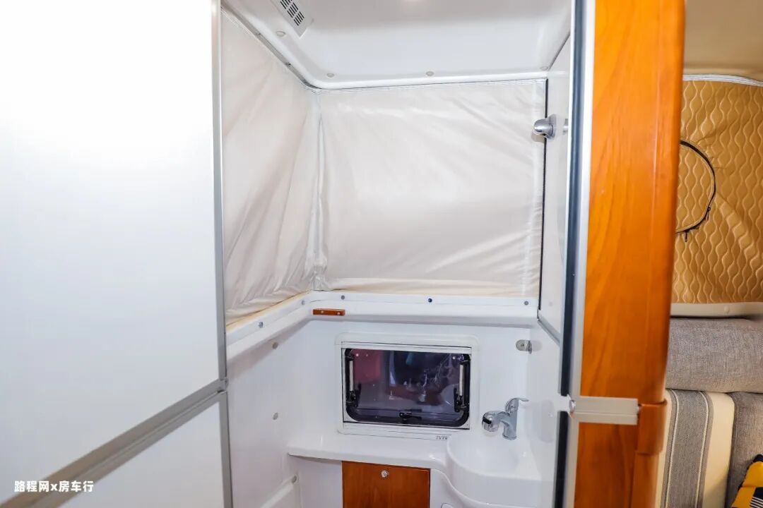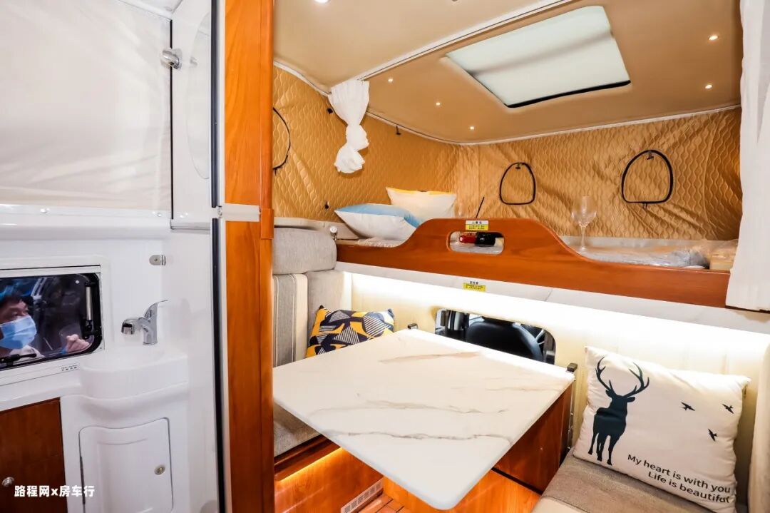 车身尺寸为5480*2050*2180mm,整体小巧精致。不用担心限高、限宽问题,可越野也可进城,商旅兼备。厢体上采用轻量化板材设计,质量仅为2290KG。当然这款车型依旧是升顶设计(升顶后的内部空间高度为2米2),操作简单,一键空间拓展,实用又能有效利用空间。