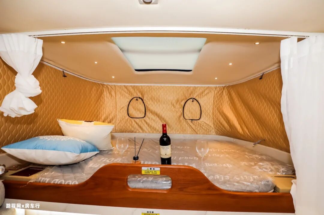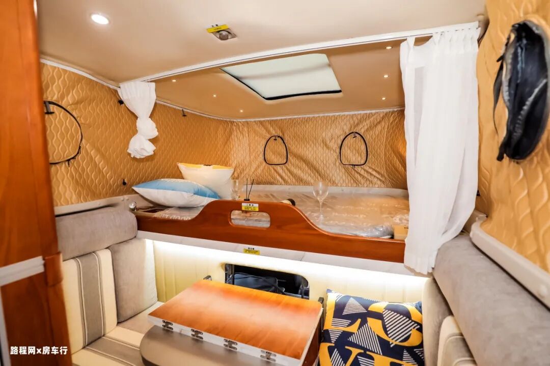 在驾驶室上方仍然是一张额头床,尺寸为1920mm*1260mm,可满足两名成年人的睡卧需求。同时还配有自动全景天窗,视野开阔,采光好。床铺周围配有拉帘,可与会客区隔开,形成独立私密空间。阅读灯、电源插座也是不可或缺的配置。