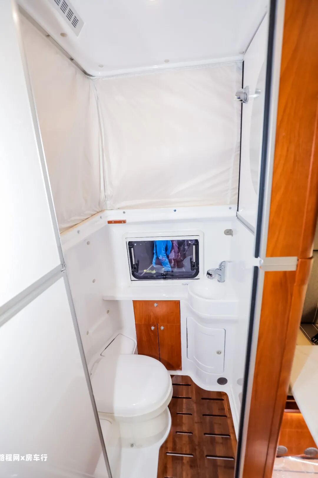 独立卫生间设计,内置洗脸台、电动粉碎马桶、储物柜、外推窗、抽拉式淋浴花洒等设施。全封闭折叠式设计,空间宽敞,日常洗浴很舒适,同时设有防水防滑柚木地板,设计很贴心。